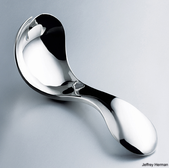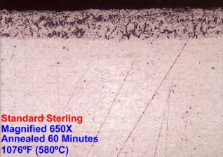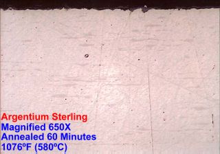 Firescale-Resistiant Sterling Alloys Tested Argentium® Sterling Silver, a registered and patented alloy developed by Peter Johns, is currently being produced by Stern Leach in the U.S. under a licensing agreement from Middlesex University, England. Argentium® Sterling Silver is a registered trade name. The addition of germanium to standard silver is a patented process licensed under Patent Nos. US 6,168,071, GB 2255348, GB 2283934 and European Patent No. 0729398. This page has been produced to provide technical information on how to work with the Argentium® Sterling Silver. Argentium® Sterling Silver has dramatically better tarnish resistance than standard sterling and will not firestain. This alloy requires minimal maintainance. An occasional wash and rinse and/or wipe with a soft cotton cloth is all that's needed to keep the object in pristine condition. Manufacturers will no longer be deluged with store returns requiring refinishing. Argentium® Sterling Silver contains at least 92.5% fine silver. The law states that sterling MUST contain no less than 92.5% fine silver with the remainder being any other metal. Argentium® Sterling Silver complies with safety standard ISO 8442-7 (a safety standard for: "Materials and Articles in Contact With Food Stuffs, Cutlery-Table Holloware"). Part 7 indicates the section for precious metals. Sterling cutlery manufacturers quote ISO 8442 in catalogs for sterling silver and silver plated cutlery. Argentium sterling can be worked using the same common sense precautions you would normally employ working with standard sterling. Argentium® Sterling Silver MSDS can be found here. My first experience using this alloy was with an unrolled ingot 5/8" wide x 4" long x .450" thick. I had decided to make a ladle, working this piece of metal to death without the use of flux to protect against firestain. I hot-forged the ingot twice, then 20 annealings, quenched, and worked the ingot cold. I felt this would be the prefect test see just how firestain resistant it was. The primary difference was judging the temperature during annealing. I witnessed a distinct difference in color; it was a very pale red glow that showed. This alloy has a melting temperature about 60 degrees below that of standard sterling, so bringing it up to a standard sterling annealing color would be too high. There is the need to allow the Argentium® Sterling Silver to "rest" before quenching or forging since it tends to be a bit brittle at this temperature. The alloy filed and abraded with silicon carbide wet-dry paper like standard sterling, perhaps a bit softer, though, you could run over the ladle with a tank without worry of distortion. The real test was to come! How would this horribly abused piece of metal hold-up to firestain? Well, I was admittedly skeptical at first, as any silversmith would be. I polished the ladle for what seemed to be an eternity, thinking that I would eventually see that wretched purple stain. It simply didn't appear! I was laughing inside as I polished, thinking that this alloy would revitalize the use of silver. I examined the surface under a 10x loupe to see if there were any irregularities in the surface...it was as perfect as standard sterling. The ladle below has been displayed among standard sterling pieces. I have witnessed no dramatic change in its color, and its almost pristine state has been in stark contrast to the now dark brown silver objects surrounding it. After a one-year span of time, normal dust and finger marks on the ladle were easily removed with tap water and a cotton towel!
