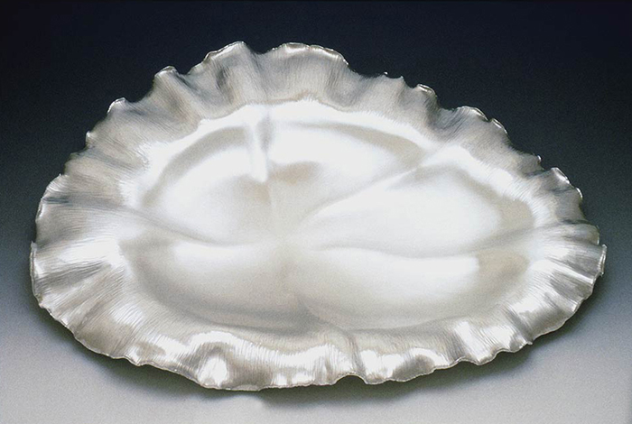 Cynthia describes her creation: The Seder plate holds symbolic foods at the Jewish Seder, a traditional meal during Passover. Hammered from a single sheet of 18-gauge (.040") sterling, this piece was made for a design competition sponsored by the Spertus Institute in Chicago, Illinois. After texturing the rim with a cross-peen hammer, I started sinking (hammering metal sheet into a hollow form) the interior. The rim was formed primarily over wooden stakes I'd made. After planishing the interior over steel stakes, I filled it with Protoplast, which supported the silver while the "veins" were chased in. Protoplast is a reusable plastic which melts in hot water. Though it lacks the flexibility of pitch, it's easier to get pieces in and out. I continued to refine the form of the rim and upset the edge with a sharp hammer (checking). The interior was stoned, sanded, and lightly polished; the linear marks emphasize the form and lead into the rim's polished hammer texture. The forms of several symbols of Passover are incorporated into this design. The shape is similar to the egg, or betzah. The ridges that define the areas for the traditional foodsharoset (apples, almonds, and wine), maror (bitter herbs), zeroah (shank bone), karpas (parsley), and betzahremind one of the veins of the karpas. The textured, undulating rim refers to the forms of parsley and lettuce. Thus, the symbols of new life and spring are emphasized. The sections nestle together like those of a seedthe source of a new beginningas Passover commemorates the dawning of a new life of freedom for Jews. Photo: Eid
