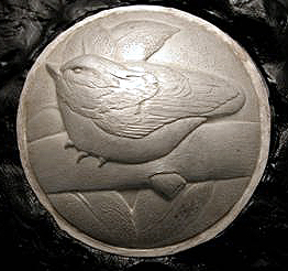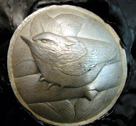 Completed Sterling silver Nuthatch with leaves, 2 inch diameter, patinated.
