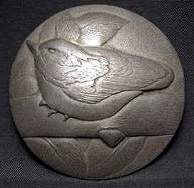 Completed Sterling Silver Nuthatch with leaves, 2 inch diameter,