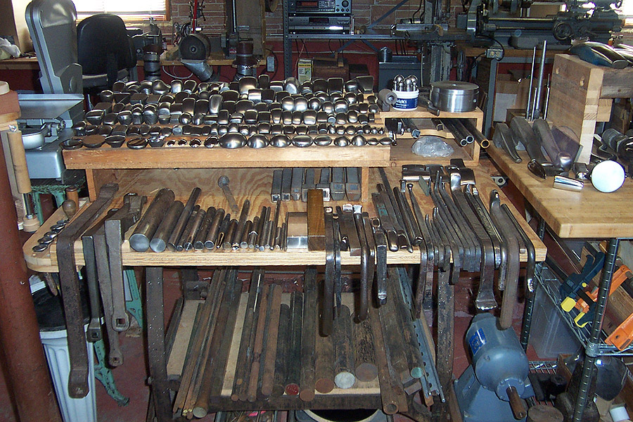 What you're looking at: The highly polished forming tools in the rear are called heads. Heads are primarily used for burnishing out dents and are held in the right-angle horses (hanging on the table to the left). Next to the horses to the right are various tools for burnishing out dents and forming. To the extreme left of the horses are forged railroad spikes that make fantastic spoon stakes when ground and polished. Bar stock is maintained under the table for making new tools.