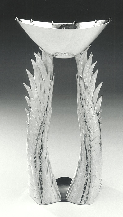 tall x 7¼" wide x 5½" deep. The large wing structure needed a great deal of heat in order to solder on small individual feathers. The feathers that had already been layered, quickly became hot at the tips, as did the feathers being soldered on. I had to use a glass fiber welding cloth to help protect the feathers from melting near where I was soldering. Two torches had to be used at once: one with a large bushy flame for heating the body of the piece, and an oxyacetylene torch with a small tip for soldering. The base was cut out of 18-gauge sheet, formed and fitted to the base of the wings; then it was soldered to the wings, one at a time. I had to build a platform on which to strap the piece for support, one that would also allow me to get under it with the torch in order to heat from below. I used two torches for this process as well, as described above. After the first wing was soldered on, I had to clean up the solder seam before soldering the second wing. When both were soldered, I cleaned and polished the base. At the same time that the wings were being built, the bowl, which is the oil receptacle at the top of the piece, was raised. I calculated how many hours the oil should burn and how much oil would be needed. This gave me an idea as to how large the bowl should be. After raising and planishing the bowl, I cut and soldered the tubing for the wicks inside the rim. The bowl was polished before soldering it to the feathers, making it much easier to give the pieces a final polish afterwards. Once the wings were soldered to the base, and the bowl was complete, I fitted and soldered the bowl to the top feathers. After cleaning up the solder seams, I silver-plated the wings. Then, I polished the bowl again, which was the last step in an approximately eight-month project. Photo: Douglas Yaple |