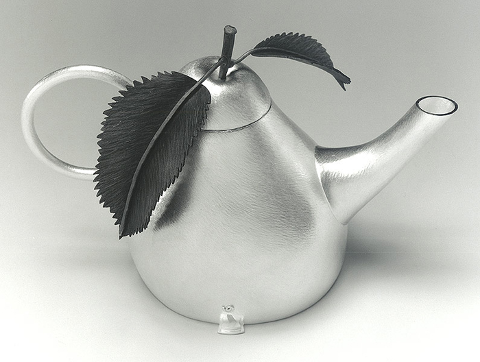 Made in 1996, Marilyn summarizes the process: The teapot was designed upon finding the perfect pear as a model. The form was made by hammering a 6" disk of 18-gauge (.040") sterling sheet over T-stakes and mushroom stakes. A general bowl form was developed before the actual pear form was defined using plastic and metal hammers over stakes, and sometimes air. The pear was formed upside down with the opening on the wide end. After planishing the form to smooth the surface, the lid was sawed off. I formed the spout from one piece of metal and filed to fit the curve of the pear. It was then soldered to the form. The small "doorways" were fabricated, adding another dimension to the teapot as a dwelling. A sheet of sterling was then sawed to create the bottom of the teapot. The lid and top interior rims were finished by adding rings of sheet to each. The handle was made from a piece of 4-gauge (.204") round sterling wire. The final additions were the two copper leaves which were sawed, formed, and colored with gesso and colored pencils. The leaf unit is threaded through a hole in the lid and connected by a nut inside. The entire surface has a file finish. "Silver Pear" took approximately 25-30 hours to complete. Photo: Philip Cohen |