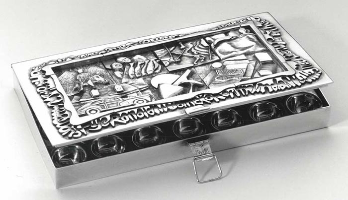 Each compartment in the body of the box was made from a 1"-square sheet of 17-gauge (.045") fine silver that was dapped into a steel die using a round punch. The 28 sections were then soldered together and a diamond-shaped piece of gold was soldered at each intersection. The compartments were then soldered into the frame. The pill box has a hinge and tackle box-like catch on the front. A work of art or metalsmithing must ultimately stand on its own merits. The hard work, precious materials, and technical achievements count for little if the design does not reflect a significant personal form of expression within the life and times of this last part of the 20th century. Photo: Arling Photography Made of sterling, fine silver, and 14 karat gold, the box is about 6" long x 4" wide x ¾" deep. Ron describes the enormous effort that went into this project: My pill box was completed over a one-year period. I had to restart the project because I was not pleased with the compartments I had made for the inside. The design time for the cast sections of the lid was immense. My work was sporadic at best and there were long periods when I did not have a chance to work. It became a giant soldering project; there are over one hundred soldered parts using hard, medium, and easy solders, as well as some gold solder. The pill box was made insections and then each section was soldered together. For example, the models for the cast sections in the lid were carved from hard wax, cast, and soldered together. Gold elements were soldered on, then chased and engraved before the entire component was soldered into the lid. |