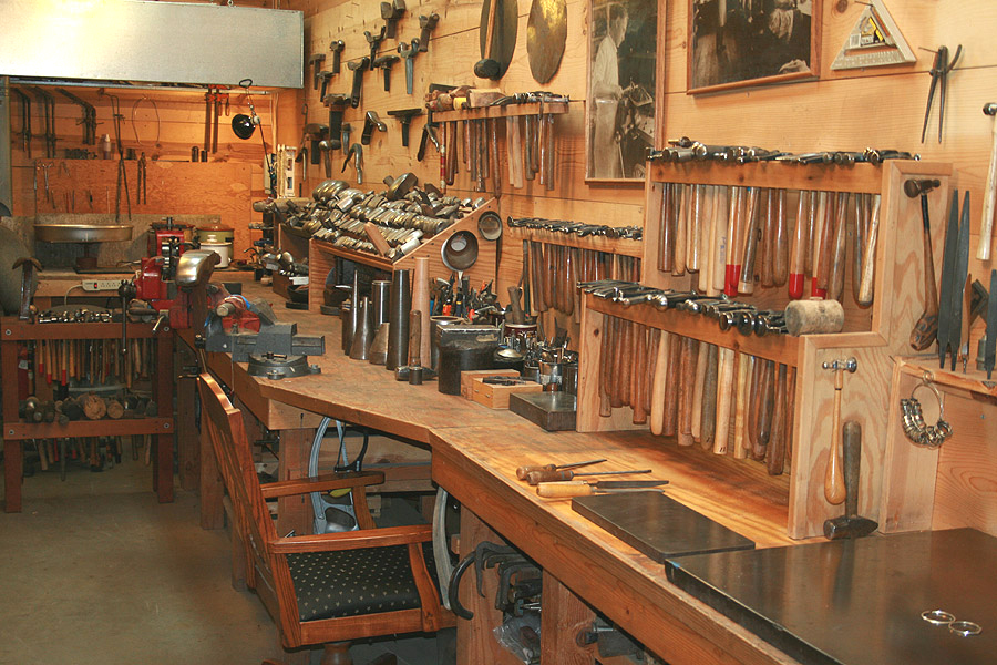 What you're looking at: Soldering station with fume hood, heads and hammers mounted in racks against the right wall, surface plates on the bench top.