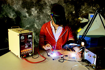 I had a Kobayashi Maru experience writing this article. Star Trek aficionados, or Trekkies (which I don't claim to be, really), will remember this as the conundrum offered to Starfleet Academy matriculate potentials -- a double-bind situation with no clear or correct solution. Captain James T. Kirk managed to be the only cadet to outmaneuver the test by hacking into the test console and changing the rules...and I followed his example in my comparison of the practical application of three different welding tools for findings attachment, general assembly, and repair. Please allow me to beam up my results. AJM Magazine asked me to perform a comparative analysis of three welding systems' performance in several different precious metal welding applications. I was to analyze the PUK 2 spot welder, which was developed by Lampert Tools USA Inc. and supplied to me by SEP Jewelry Tools of Chicago; the Mini Pulse III from Aelectronic Bonding Inc. (ABI) in Calhoun, Georgia; and a laser welder. (I used my Starweld by Rofin-Baasel, which I purchased from Manufacturing Technologies in San Diego, but the results presented in this article are accurate for most laser welders used in the jewelry industry.) AJM challenged me to decide which machine was best for various applications. But like our hero Kirk, I had to change the original rules of the assignment to accomplish my goal. My initial attempt to determine which tool might be more useful for specific welding applications led me to the conclusion that, in many cases, one machine was not distinctly "the best" for performing an application. In fact, there are so many crossovers in the valuable use of these machines that it would be difficult to actually approach the topic just that way. In addition, deciding which system is best for your shop depends on economic factors such as your overall cash flow, margin per unit, cost of labor versus that of the technology, time management, and training expenses. Therefore, I decided to explain the advantages and disadvantages of how each machine performs in specific applications, as well as provide the technical specifications available for each. It is my hope that this data will enable you to better weigh the pros and cons of each system and decide which is best for your needs. The Technology Of the three welding systems I tested, the PUK 2 and Mini Pulse III use similar pulse-arc technologies. An arc is formed between a non-consumable tungsten electrode and the metal being welded, forming a molten pool. If filler material is used, it is fed separately into the molten pool. The use of an argon shielding gas can considerably reduce oxidation and facilitates a smoother transfer of filler material. This is very similar to GTAW (Gas Tungsten Arc Welding), which is often referred to as TIG (Tungsten Inert Gas) welding -- the method of choice in steel fabrication shops where high quality precision welding is required. The biggest difference between the pulse-arc systems I tested and TIG welders is that the latter use a continuous arc, allowing for an uninterrupted seam as the electrode is moved across the weld interface. Pulse-arc welders do just what they say -- pulse an arc in a burst of electrical energy. Laser welders, on the other hand, use Nd:YAG laser beams generated by flash lamps. Although a laser welder's high pulse frequency may lead you to believe that it produces a continuous weld seam, it too is actually producing single, overlapping spot welds just like the pulse-arc welders, only much more rapidly. Welding Applications When the two pulse-arc welders arrived at my shop for testing, I could hardly wait to get started. Both were very easy to set up, and after a few weeks of research and preliminary testing, I was ready to begin comparing them. The following are the results of several applications tests. 1. Continuous Seam Weld: Installing a clasp on a bracelet and performing a dovetail sizing. A semi-continuous seam can be achieved by any of these machines using overlapping spot welds, but it can be a tedious task if a long weld seam is required. Speed is certainly an advantage in this application. If multiple pulses are required to complete a job, a laser is the quickest tool for the task. Most can pulse up to 20 times per second -- warp speed compared to the pulse-arc welders, which require a much stronger electrical pulse to create the welding arc and thus have a longer capacitor refresh rate. The Mini Pulse III has a faster refresh than the PUK 2, providing two pulses per second compared to one pulse per 1.7 seconds, respectively. Due to its slightly faster pulse rate, the Mini Pulse III may be a better choice than the PUK 2 for welding applications that require a continuous weld seam. Interestingly, the incredibly rapid refresh rate achieved by the laser, which also allows for extremely fast metal build-up and overlay, considerably heats up the work piece. In my shop, we routinely use tweezers, pliers, or insulating gloves to hold objects that require multiple, high energy pulses. Occasionally, we have to put the piece down for a cool-off period before continuing the weld process, which can cost valuable shop time. We did not experience this problem with either of the pulse-arc welders, as the slower pulse rate prevents rapid heat-up in most components. 2. Welding in Tight Spots: Attaching a four-prong head to a freeform cluster ring. One of the greatest advantages of the laser is its accessibility to just about anywhere on a piece. Basically, if you can see it, you can weld it with a laser. Operating through a high power binocular microscope, you can place the crosshairs of the laser in the most recessed and hidden areas of a piece. This allows for extremely tricky assembly and repairs, such as the project shown here in which I am attaching the base of a four-prong head to a freeform cluster ring. Unlike laser welders, both pulse-arc welders rely on a handpiece with a tungsten electrode and a separate